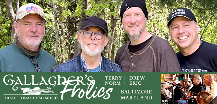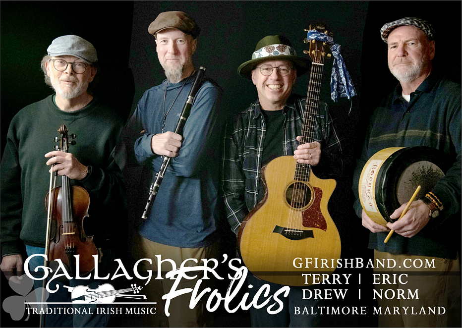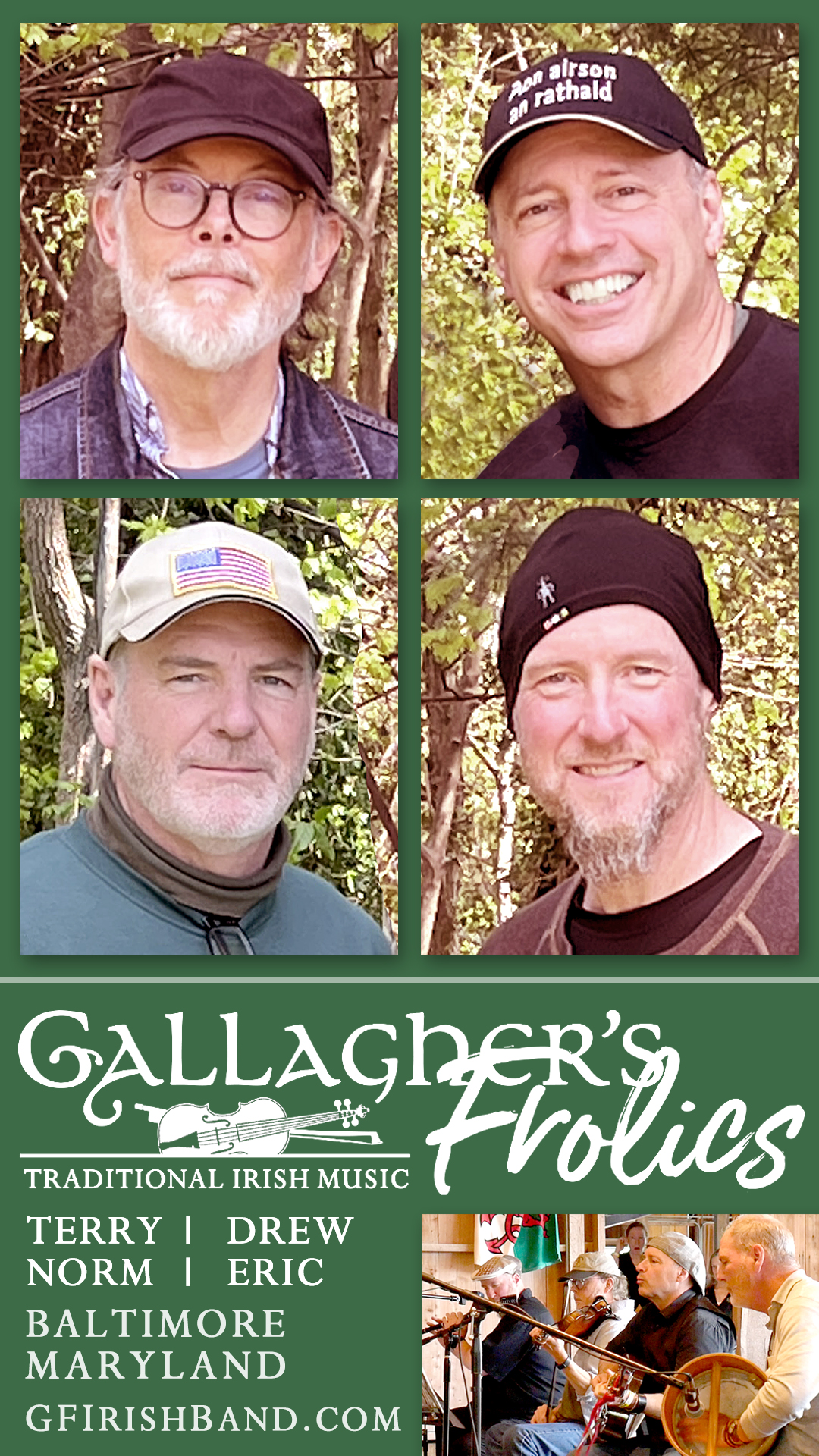 Drew is a standout vocalist whose style has been honed over many years performing in genres ranging from folk to rock. Terry's fiddling is influenced by his study of revered musicians of the past hundred years, from Michael Coleman to Denis Murphy. "Seamus" Sloan has channelled years of classical training into his signature flute style that combines expressive nuance with impeccable technique, when, combined with Terry's fiddling, creates a powerful sound. Norm Myers ties it all together with his steady hand on bodhran and bones. The band has been together since 2023 and often performs with the Irish Dance group Tir Na nOg at area festivals. Gallagher's Frolics presents a masterful mix of energetic instrumentals and moving, richly layered songs that is steadily gaining attention throughout the Mid-Atlantic region. Website: GFIrishband.com